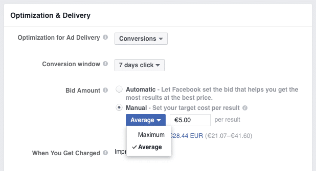 Khi bạn chọn lựa “Average” bid, bạn nói với Facebook biết đâu là tổng tiền trung bình bạn muốn chi cho mỗi chuyển đổi. Facebook sẽ làm tốt nhất có thể để phân phối các kết quả phù hợp nhất trong giới hạn ngân sách và giá thầu của bạn.