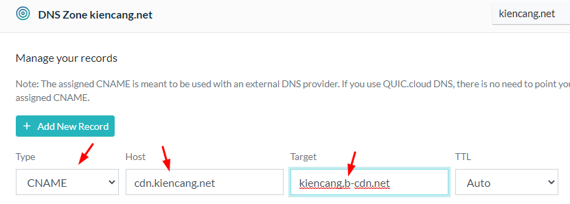 Một cửa sổ nữa bật ra, yêu cầu bạn trỏ CNAME từ cdn.kiencang.net (tên miền CDN tùy chỉnh) về kiencang.b-cdn.net (tên miền pull zone). Bạn sẽ phải vào phần tùy chỉnh DNS của tên miền để làm điều này (có thể là từ nhà đăng ký tên miền, hoặc bên trung gian thứ ba như Cloudflare, QUIC cloud, vân vân).