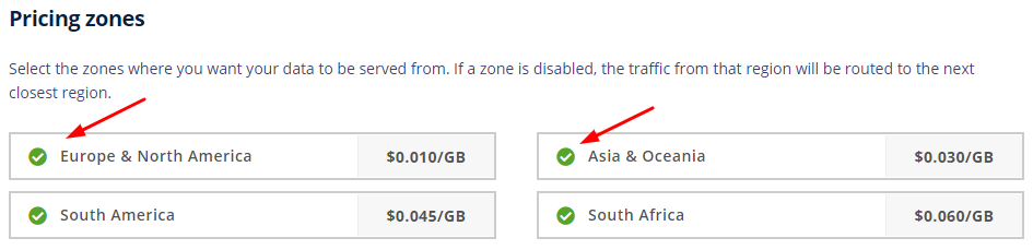Kéo tiếp xuống bên dưới bạn sẽ thấy giá CDN cho từng khu vực (Pricing zones):