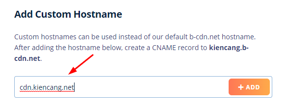 Tiếp theo bạn nhập tên miền tùy chỉnh vào ở phần Add Custom Hostname, ví dụ cdn.ten-mien-cua-ban.com, ở trường hợp này tôi nhập cdn.kiencang.net, tiếp theo bạn nhấn ADD: