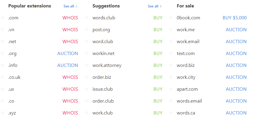 - AUCTION: là tên miền đấu giá, đã có người sở hữu tên miền này, nhưng họ đang muốn bán nó đi.