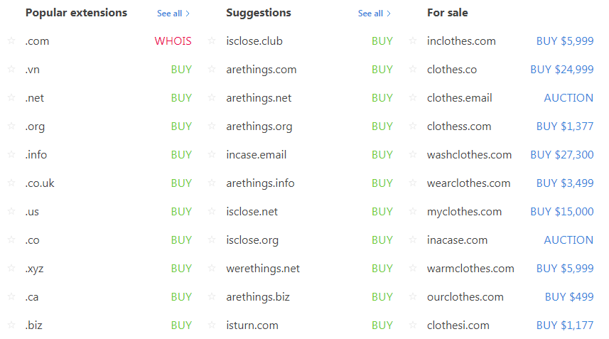 - Để bán (for sale): là các tên miền họ thấy liên quan đến từ khóa gốc của bạn nhưng đang được rao bán công khai (thông qua hình thức đấu giá / auction, hoặc niêm yết giá cụ thể để mua).