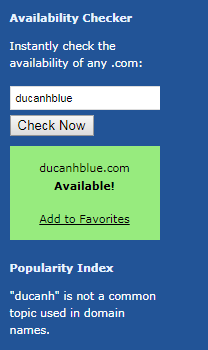 Ở bên tay phải góc bên dưới có ô để bạn kiểm tra tính khả dụng đăng ký của một tên miền nào đó ngay lập tức, còn dưới cùng là thông báo từ “ducanh” không phải là thuật ngữ tìm kiếm phổ biến: