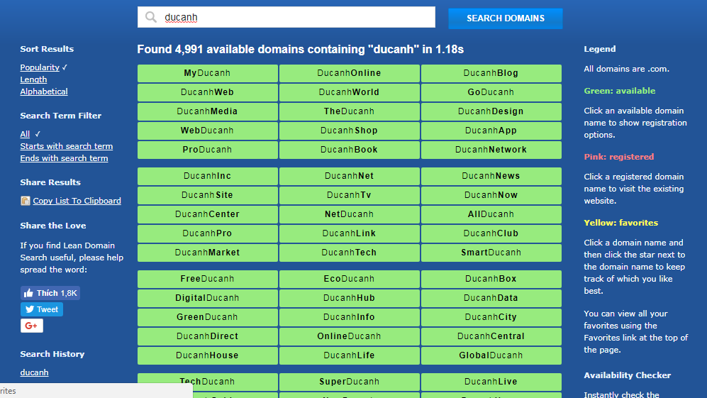 Bạn có thể thấy, trang cung cấp tới 4991 kết quả gợi ý có chứa từ đức anh và hiện tại đều có khả năng đăng ký (màu xanh), có danh sách này chính là họ kết hợp các tiền tố và hậu tố mà tôi đã nói ở phần trên cho từ khóa người dùng muốn có trong tên miền.