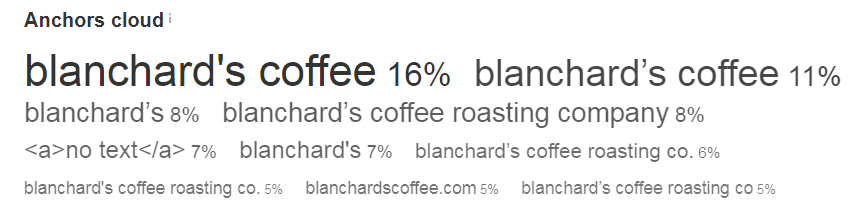 Trong ví dụ bên dưới từ thương hiệu của Blanchard’s Coffee Roasting Co, tất cả các văn bản neo trong đám mây đều là thuật ngữ thương hiệu: