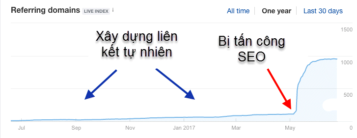 Nếu bạn từng đăng nhập vào Site Explorer và nhìn thấy một khối lượng lớn tên miền không mong muốn trỏ đến tăng vọt lên, điều đó có thể chỉ ra rằng trang của bạn đã bị tấn công: