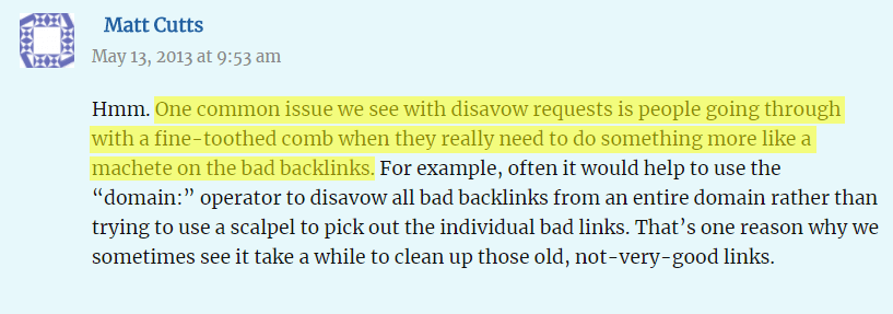 Trong khi điều rút ra ở đây phải là sự chứng thực từ chối ở cấp độ tên miền hơn là cấp độ URL (đọc qua phần được đánh dấu ở trên), âm thanh mà nhiều người nghe được là “disavow links với dao rựa chứ không phải dao mổ”.