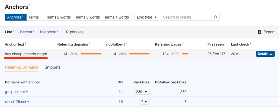 Nếu chỉ một hoặc hai thuật ngữ nổi lên, bạn có thể lựa chọn báo cáo “văn bản neo/anchors” và “các chi tiết/details” để xem các tên miền trỏ về và các backlink với văn bản neo liên quan: