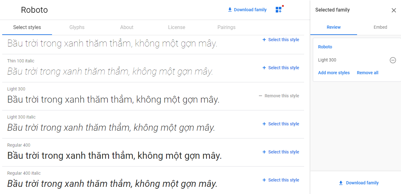 Nếu bạn trực tiếp nhúng font từ Google Fonts, bạn có thể lựa chọn các weight khác nhau giống như thế này (bạn “select this style” thêm vài cái và chuyển sang tab embed):