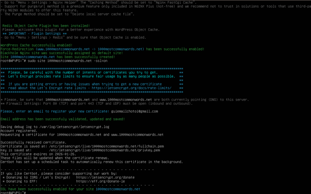 Tương tự, cũng phải thay example.com bằng tên miền của bạn. Bạn nhớ phải trỏ tên miền về IP của VPS, và các cổng của Ubuntu được mở thì nó mới tạo được cái https (liên kết bảo mật cho tên miền).
