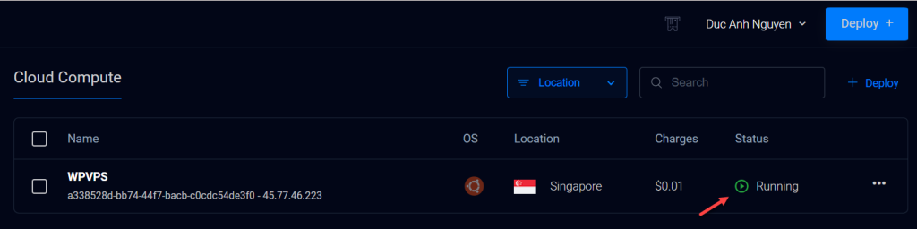 Ta quay lại trang Vultr. Click Running để vào phần thông tin VPS.