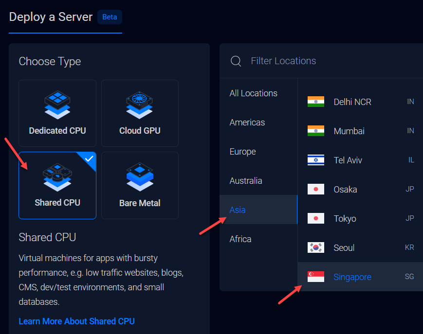 Chọn Shared CPU > Asia > Singapore (nếu người dùng của bạn chủ yếu ở Việt Nam, nếu ở khu vực khác hãy chọn vị trí gần nhất có thể):
