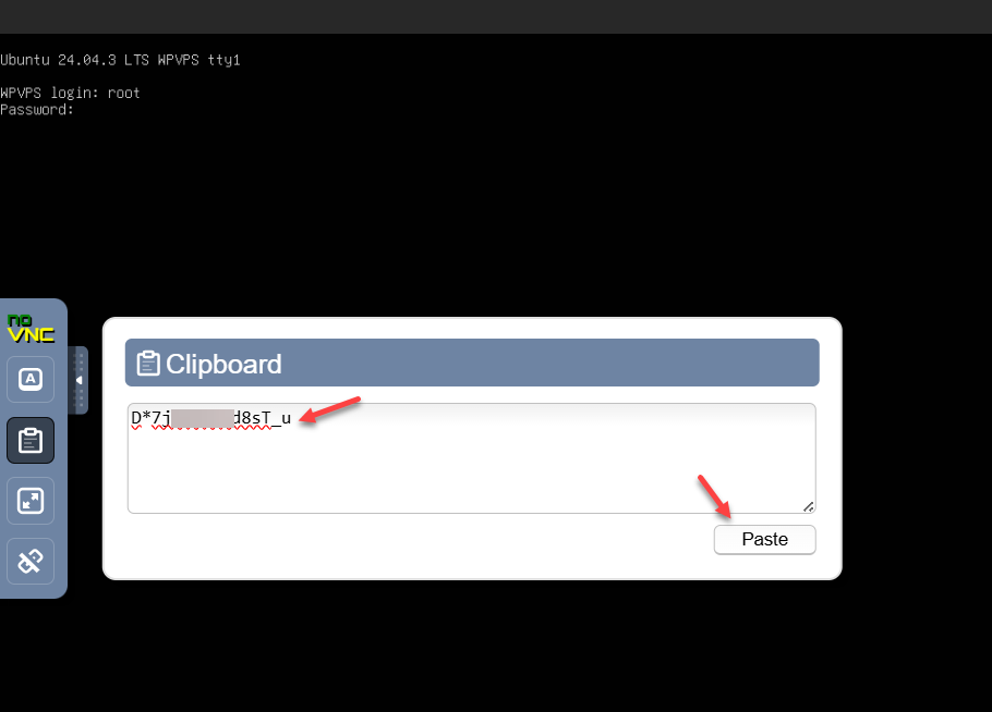 Ở phần login, nhập root. Nó sẽ hỏi password, bạn copy pass ở phần thông tin VPS (nhấn vào biểu tượng cạnh con mắt để copy) rồi paste vào đó (nhấn Paste xong, đợi khoảng 30s, sau đó đóng clipboad lại rồi nhấn Enter). Vì là pass nên khi paste nó không hiện ra các ký tự cho mình thấy, nên bạn cần đợi khoảng 30s để chắc chắn pass đã được paste đầy đủ.