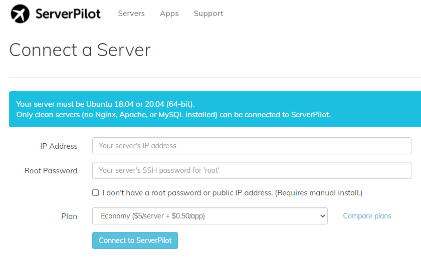 Máy chủ mà bạn cài trên Vultr phải là Ubuntu phiên bản 18.04 hoặc 20.04 loại 64 bit. Và đây là máy chủ sạch KHÔNG cài sẵn bất cứ thứ gì (bao gồm không Nginx, Apache, hay MySQL, các cái này ServerPilot sẽ lo cho bạn).
