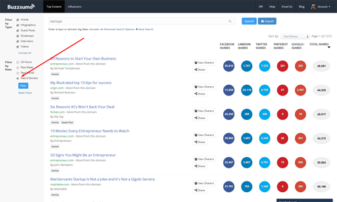 Với các đặc điểm cơ bản của khách hàng tiềm năng trong đầu, bạn có thể sử dụng các công cụ như BuzzSumo, Google Search, Google News và Ahrefs để tìm các ý tưởng gợi cảm hứng cho khái niệm tổng thể. Gõ xuống các từ khoá (ví dụ, sở thích hoặc đặc điểm của khách hàng mục tiêu) để bạn thấy các chia sẻ nhiều nhất trên web liên quan đến thuật ngữ nào – chọn mốc 6 tháng gần đây để có nhiều thông tin hơn.