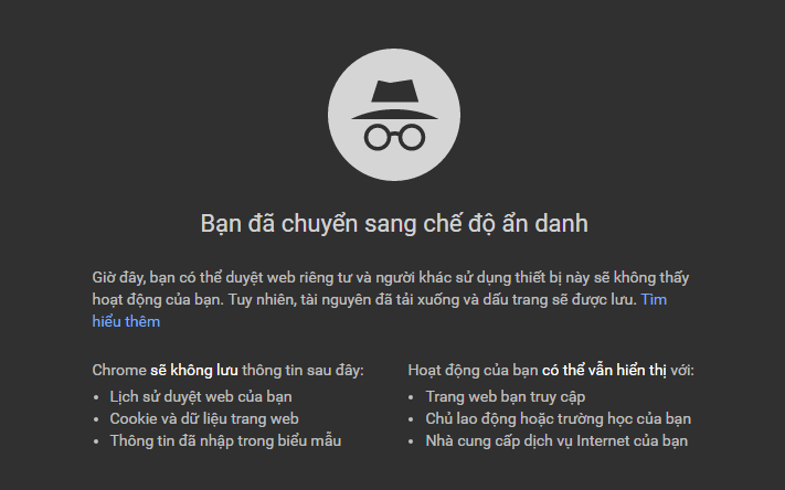 Chế độ ẩn danh trên Google Chrome các bạn chỉ cần ấn Ctrl +Shift + N, nó trông giống như thế này (với biếu tượng đội mũ, đeo kính như kiểu thám tử, trông rất bí ẩn):