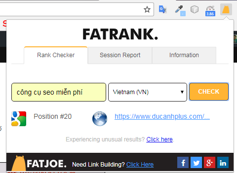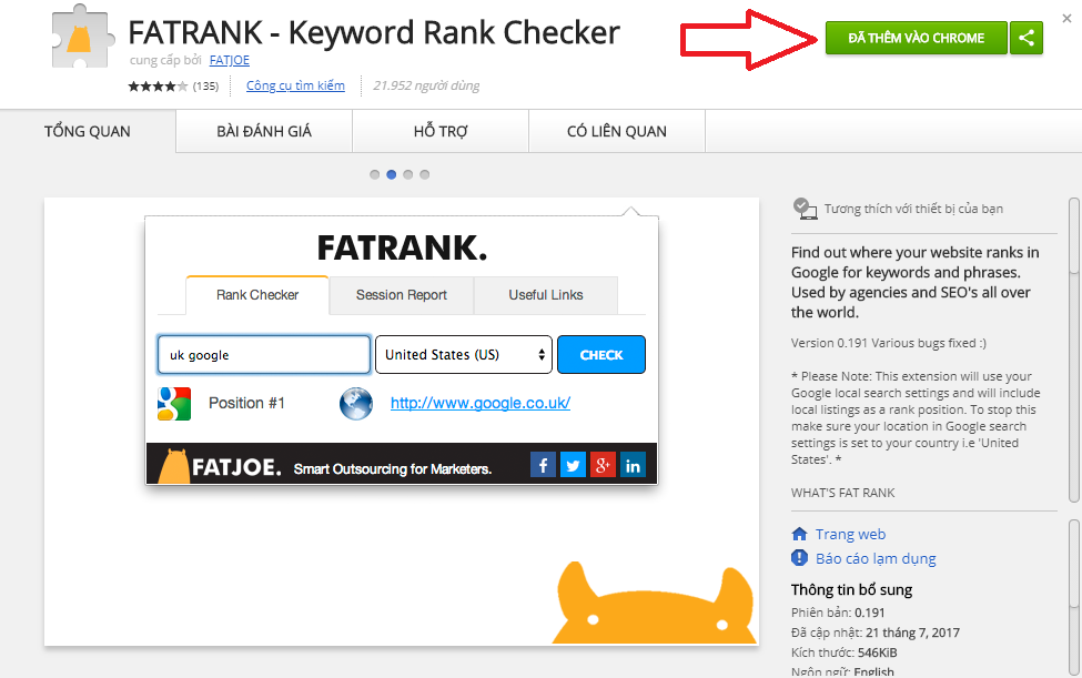 Cách này sẽ giúp loại bỏ vấn đề từ khóa nằm ngoài top 10. Tiện ích mở rộng có tên FATRANK giúp chúng ta kiểm tra ngay thứ hạng của một trang cho một từ khóa nào đó. (Vì mình đã cài trên trình duyệt của mình rồi nên nó có chữ “đã thêm vào chrome”, còn bình thường bạn nhấn vào nút mũi tên mình chỉ để cài đặt):
