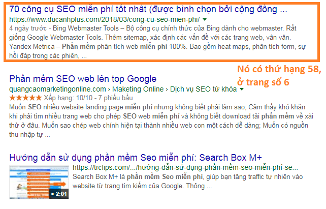 Ví dụ như bài viết với từ khóa “phần mềm SEO miễn phí”, phải đến trang thứ 6 mình mới thấy thứ hạng của nó: