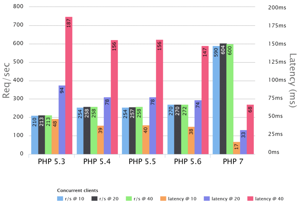 Với sự ra đời của PHP 7, nó ảnh hưởng rất lớn đến hiệu suất! Ảnh hưởng lớn đến mức mà nó phải là ưu tiên cao hơn so với rất nhiều tối ưu hóa nhỏ bạn có thể thực hiện cho trang WordPress. Bảng điểm chuẩn sau chứng minh hiệu suất cải thiện đáng kể của PHP 7 so với các phiên bản trước của nó. PHP 7 cho phép hệ thống thực hiện số lượng truy vấn nhiều hơn hai lần so với PHP 5.6, điều đó có nghĩa là giảm đi được một nửa độ trễ.