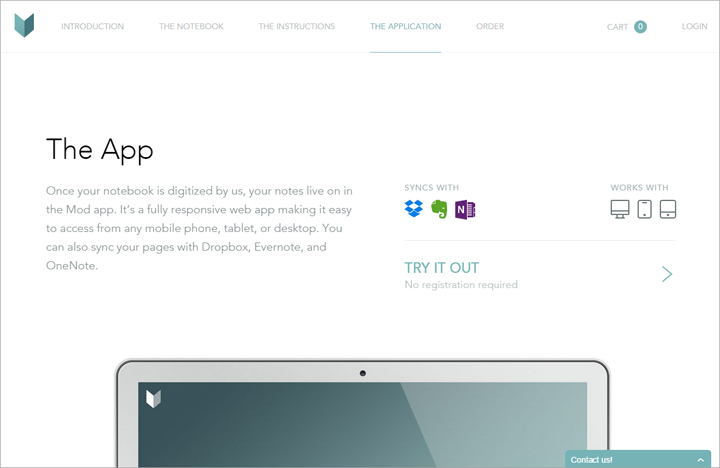 Trái lại, một khi người dùng bắt đầu cuộn chuột, trang Mod Notebooks thực hiện tốt công việc của nó là khuyến khích người dùng khám phá thêm. Trang cung cấp các tùy chọn điều hướng dựa trên văn bản neo để giúp người dùng nhảy vào các chủ đề mà họ thích. Trên các màn hình có kích cỡ đa dạng, văn bản và hình ảnh trải rộng trên các trang, dẫn người dùng đến nhiều thông tin hơn. Nội dung được tổ chức tốt và xây dựng câu chuyện về sản phẩm, khuyến khích người đọc tiếp tục cuộn chuột.