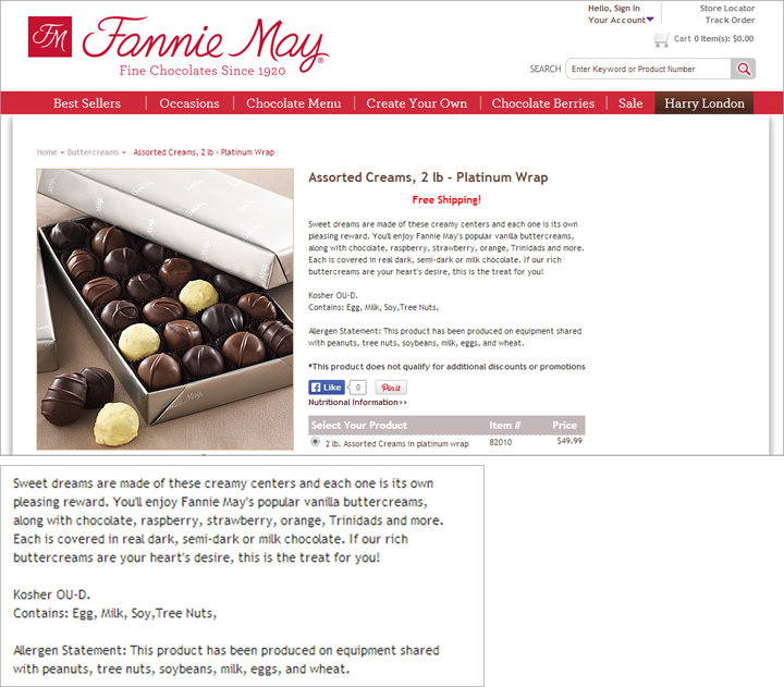 Thậm chí chỉ cần một dòng văn bản không trả lời câu hỏi của sản phẩm cũng có thể khiến người dùng thấy nghi ngờ hoặc bị đánh lạc hướng. Trong ví dụ bên dưới, Fannie May bắt đầu một mô tả các loại kem với văn bản, “Các giấc mơ ngọt ngào được làm từ nhân những cây kem này và mỗi cái đều là phần thưởng xứng đáng của chính mình“. Tất cả những gì chúng ta biết ở đây là kem này có nhân. Đoạn mô tả kết thúc với “Nếu sản phẩm nhiều bơ sữa của chúng tôi là mong muốn từ trái tim bạn, nó sẽ là bữa tiệc cho bạn!” Một câu mô tả sản phẩm chính xác, liệt kê các loại chocolate bên trong hộp, tiếc là lại kết thúc như này “…chocolate, dâu rừng, dâu tây, cam, Trinadads và nhiều thứ nữa“. Có hai câu hỏi không được trả lời: Trinidad là gì? Và “nhiều thứ nữa” có nghĩa là gì?