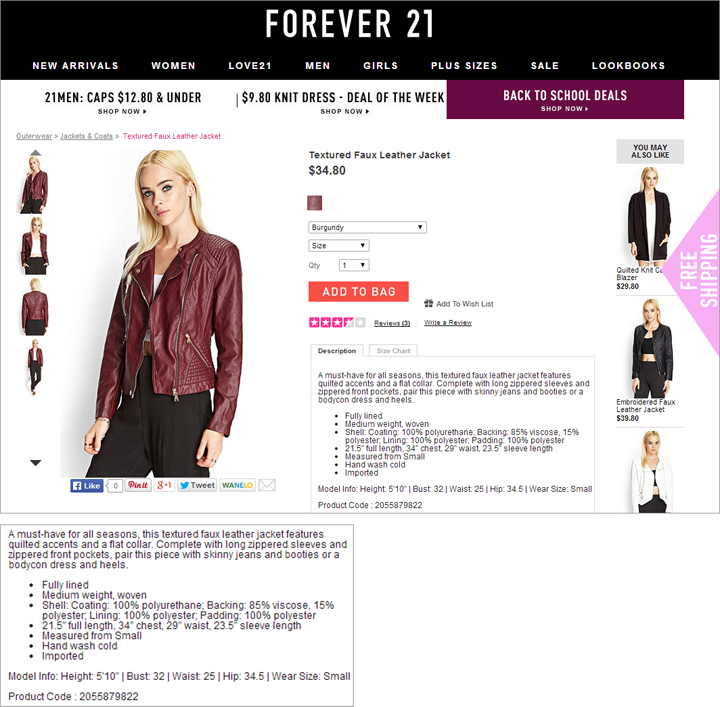Trái lại, phần mô tả sản phẩm trên trang Forever 21 có được điểm mấu chốt nhanh chóng. Chiếc áo jacket giả da (faux-leather) được mô tả như sau “Chiếc áo cần phải có cho mọi mùa, áo jacket giả da này có điểm nhấn là vải lót bông bên trong (quilted accents) và cổ áo bằng phẳng (flat collar). Được hoàn thiện với tay áo dây kéo (zippered) và túi trước dây kéo, rất hợp khi mặc cùng quần jean bó sát và giày bốt hoặc đầm dáng ôm (bodycon dress) và giày cao gót“. Mô tả ngắn gọn này bao gồm thông tin về các mùa thích hợp để mặc jacket, thiết kế chi tiết, và thậm chí cả lời khuyên cho cách phối đồ. Danh mục chấm tròn theo sau bao gồm chi tiết bổ sung, như kích cỡ, chất liệu và hướng dẫn bảo quản. Bốn bức ảnh cũng cho thấy áo jacket từ các góc nhìn khác nhau, cung cấp ý tưởng hoàn chỉnh về sản phẩm.