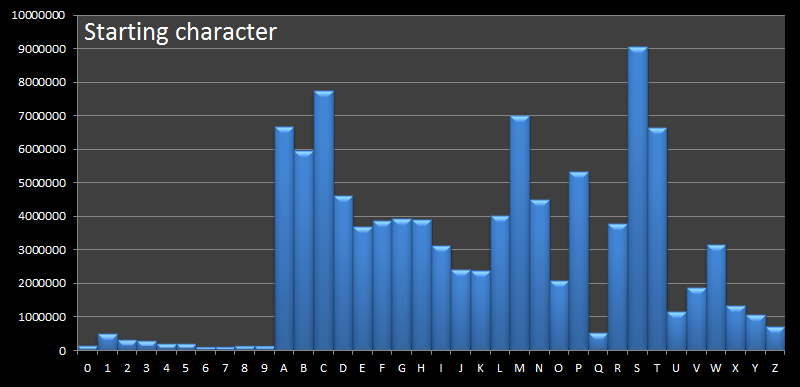 Chúng ta đã biết ký tự phổ biến nhất trong tên miền là từ nào rồi, nhưng ký tự nào là ký tự bắt đầu phổ biến nhất cho tên miền? Chúng tôi đã thực hiện nhanh một truy vấn để tìm ra điều này: