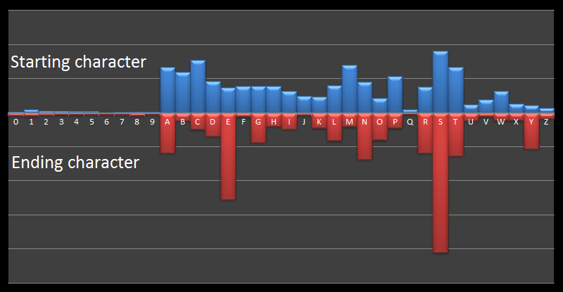 Cùng kiểu thống kê nhưng lần này là cho ký tự kết thúc. Lưu ý là hai biểu đồ có tỷ lệ khác nhau. Một lần nữa S là ký tự kết thúc phổ biến nhất, nhưng với tần suất gấp đôi. (Tôi đoán rằng có rất nhiều tên miền được viết dưới dạng số nhiều).