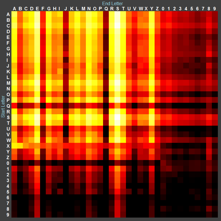 Ô vuông sáng nhất trên biểu đồ là S%S, chúng xuất hiện đến 1,869,669 lần; sự kết hợp phổ biến nhất của ký tự đầu và ký tự cuối.