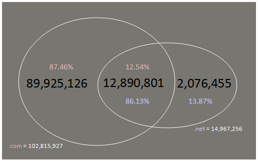 Sự thống trị của tên miền .com có thể thấy từ sơ đồ hình Venn ngay bên dưới đây với sự so sánh chồng chéo của hai không gian tên miền.