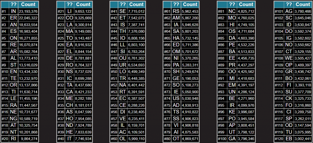 Một số cặp ký tự xuất hiện với tấn số thường xuyên hơn so với những cái khác. Tìm kiếm thông qua không gian tên miền .com, có thể xác định rằng cặp ký tự IN xuất hiện với tần số cao hơn so với bất kỳ các cặp ký tự nào khác (với tần số lặp lại là 23,193,376 lần). Dưới đây là top 120 cặp ký tự: