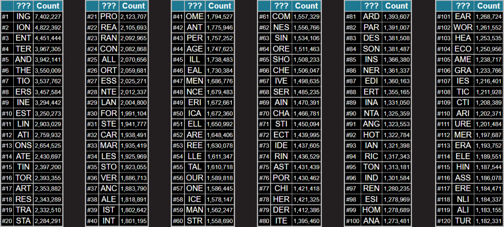 Chuyển sang từ dạng 3 ký tự, chúng tôi nhận thấy tần số cao nhất thuộc về ING với số lần tìm thấy là 7,402,227 lần. Một điểm thú vị cần lưu ý là mặc dù THE và AND có xếp hạng cao trong danh sách, nó vẫn không đánh bại được ING (phổ biến cho dạng động từ -ing trong tiếng Anh).