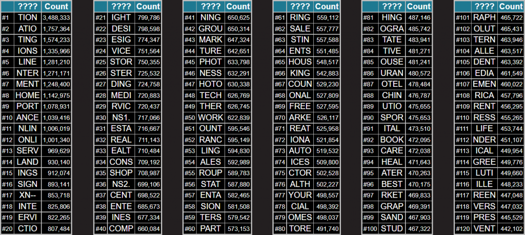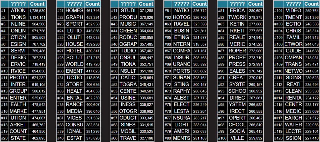 Và cuối cùng là bảng gồm top 120 mẫu 5 ký tự. Ở đây các từ đã trở nên rõ ràng hơn. Nhìn vào danh sách này sẽ là bài tập khá thú vị để đoán xem tên miền gốc chứa những ký tự này là gì.