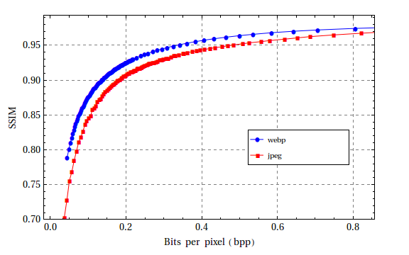 Nói tóm lại, từ các biểu đồ trên chúng ta có thể nhận thấy là WebP lúc nào cũng chỉ cần ít bít (dữ liệu) trên mỗi pixel so với JPEG để đạt được cùng chỉ số SSIM (chất lượng ảnh).