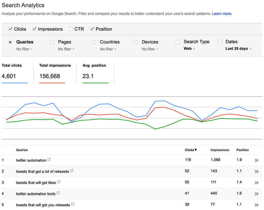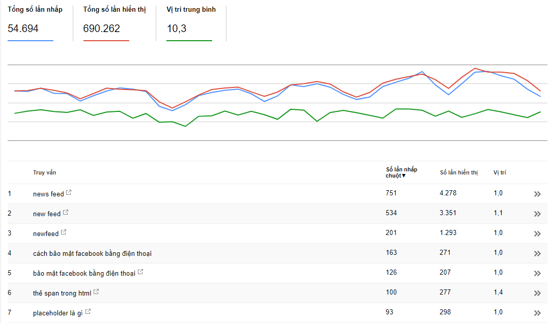 Search Console cho thấy thứ hạng trung bình cho từng từ khóa bạn có xếp hạng và có bao nhiêu lượt hiển thị và click mà chúng đem lại cho website của bạn. Dù vậy, chúng không cho thấy khối lượng tìm kiếm hàng tháng và giới hạn số lượng từ khóa chỉ 1000 từ mà thôi.