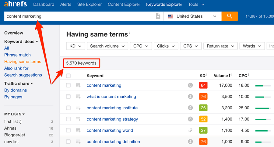 Lấy ví dụ, công cụ khám phá từ khóa của Ahrefs cho thấy có 5570 ý tưởng từ khóa cho “content marketing”.