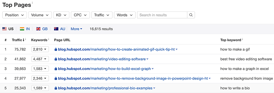 Đây là điều mà HubSpot đã thực hiện với nội dung trên blog của họ. Hãy xem các bài viết có hiệu suất cao nhất của họ thông qua Ahrefs: