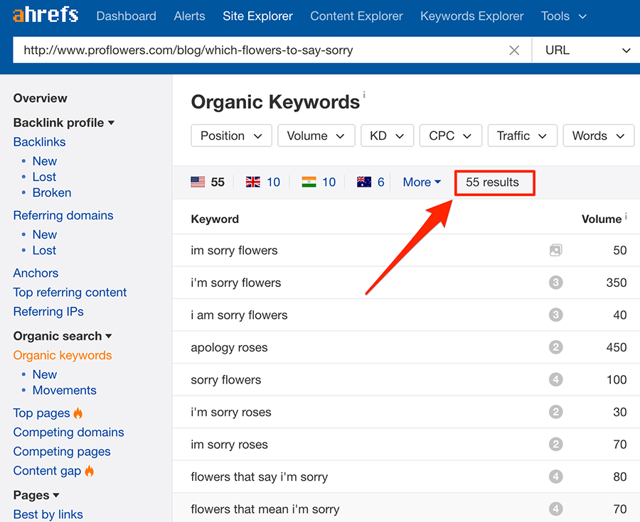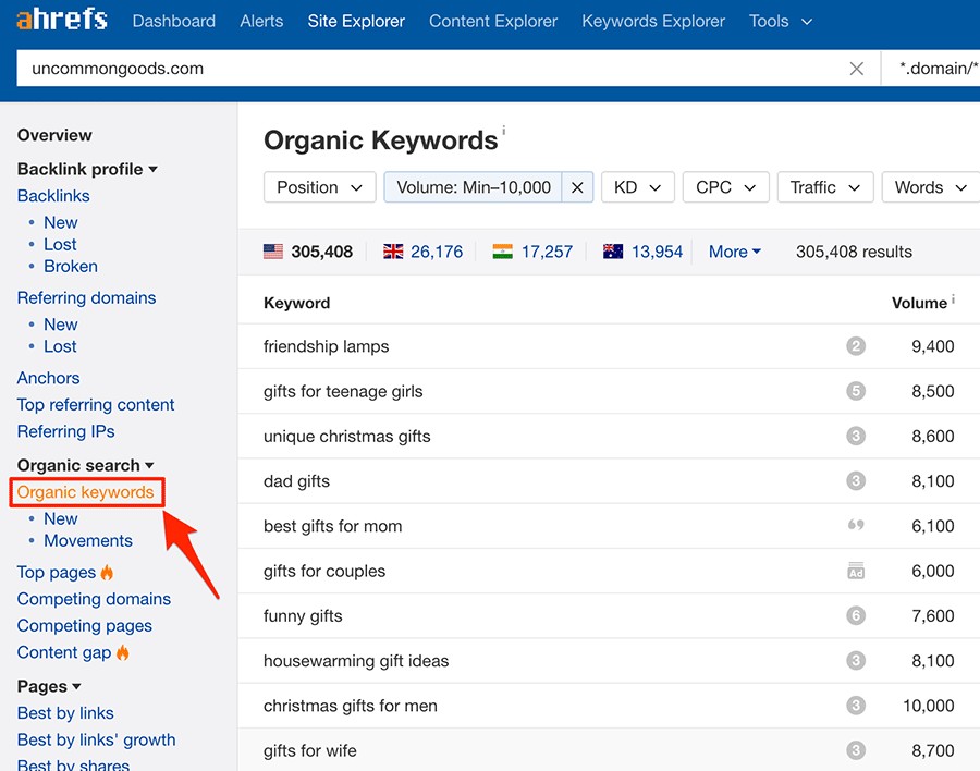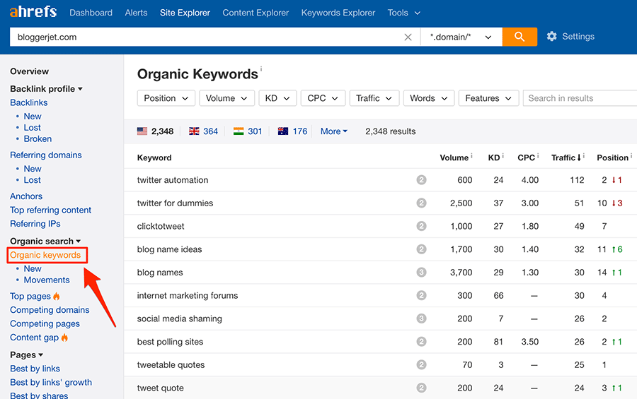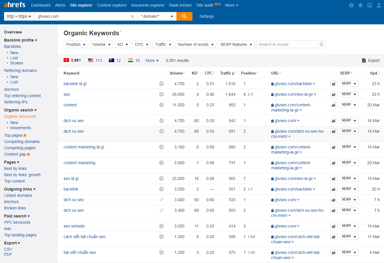 Nếu bạn cần nhiều dữ liệu hơn, bạn có thể thử báo cáo “Các từ khóa tự nhiên/Organic Keywords” trong công cụ Site Explorer của Ahrefs: