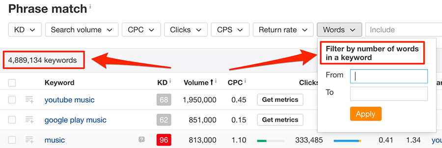 Để “thu hẹp thị trường ngách xuống”, tôi cần tập trung vào các từ khóa dài hơn và cụ thể hơn có từ ”music” bên trong nó. Vì thế tôi sẽ sử dụng tính năng lọc “từ” để thu hẹp danh sách khổng lồ các từ khóa này xuống thành nhóm cụm từ có chính xác 4 từ ở trong.