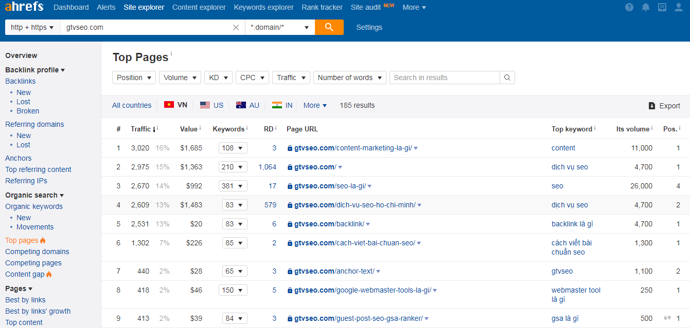 Gợi ý: Hãy đi đến báo cáo “Top Pages” trong Ahrefs Site Explorer.