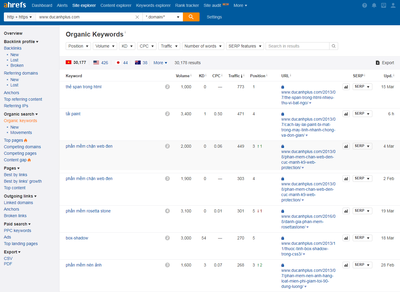 Giờ chúng ta sẽ đưa website đó vào Site Explorer của Ahrefs và duyệt các từ khóa nó được xếp hạng: