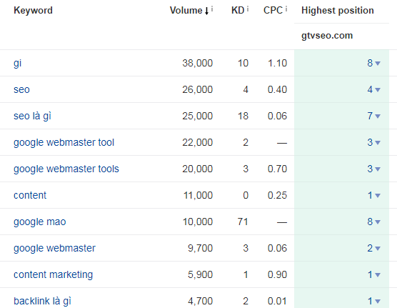 Còn ở đây, giả sử tôi coi gtvseo.com là đối thủ của mình, hãy thử xem họ đang xếp hạng cao với từ khóa nào: