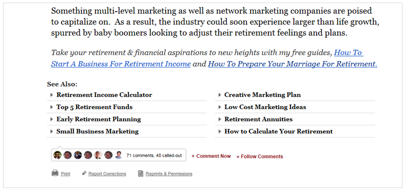 Người đọc thường không xem bài viết hiện tại thêm nữa khi các liên kết không được cung cấp ngay lập tức. Tránh chặn nội dung liên quan bằng thành phần không cần thiết hoặc khoảng trống trắng quá mức. Cả hai cách tiếp cận đều đưa ra chỉ dẫn sai cho việc kết thúc trang và ngăn cản mọi người cuộn chuột thêm nữa.