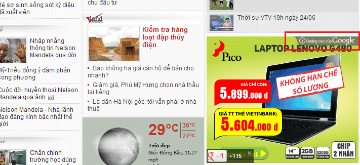| Quảng cáo của Google xuất hiện trên trang báo điện tử VietNamNet Pico sẽ trả tiền cho Google, số tiền này Google giữ lại một phần, phần còn lại họ trả cho báo điện tử VietNamNet |