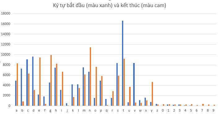 Bạn có thể dễ dàng nhận ra một số ký từ có sự khác biệt lớn về tỷ lệ bắt đầu và kết thúc. Cụ thể “b” là ký tự bắt đầu gấp gần 9 lần “b” là ký tự kết thúc, “j” bắt đầu gấp khoảng 6 lần kết thúc, “q” bắt đầu gấp 10 lần kết thúc. Ngược lại “y” kết thúc gấp gần 7 lần bắt đầu, “u” kết thúc gần gấp 5 lần bắt đầu.
