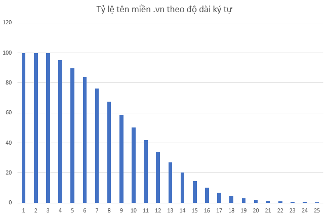 Chẳng hạn nhìn vào cột số 6, với giá trị khoảng 81, có nghĩa là có khoảng 81% tên miền có từ 6 ký tự trở lên, cột số 10 với giá trị khoảng 50, nghĩa là có 50% tên miền có từ 10 ký tự trở lên. Vị trí cuối cùng: chỉ có 0,38% tên miền có từ 25 ký tự trở lên.