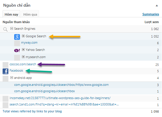 Ví dụ bạn có thể thấy trang của mình (Kiến càng) có nguồn truy cập chủ yếu từ tìm kiếm Google, rất ít từ mạng xã hội Facebook.