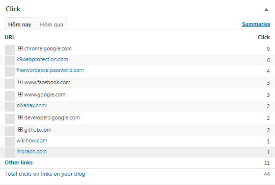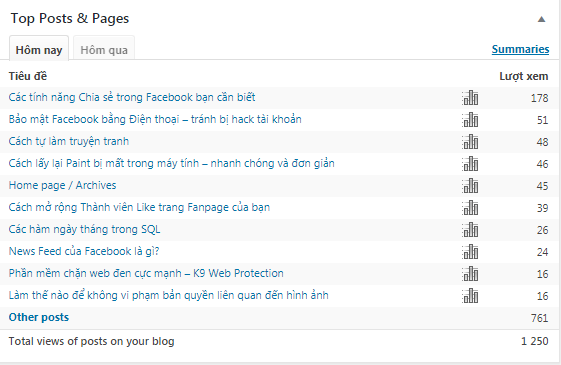 Nếu bạn muốn xem nhiều thống kê hơn cho cả các bài biết khác nữa, bạn click vào Other posts (ở góc trái bên dưới). Nếu muốn xem thống kê cho khoảng ngày rộng hơn, bạn click vào Summaries.