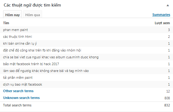 Đấy chính là các từ khóa mà người dùng gõ vào Google để tìm ra trang web của bạn. Tuy nhiên các thông tin này rất hạn chế. Có rất nhiều từ khóa mà người dùng tìm không thu thập được, và nó được thống kê bằng thuật ngữ Unknown search terms (808) – ở đây nghĩa là có 808 truy vấn chúng ta không biết là họ gõ từ khóa nào.