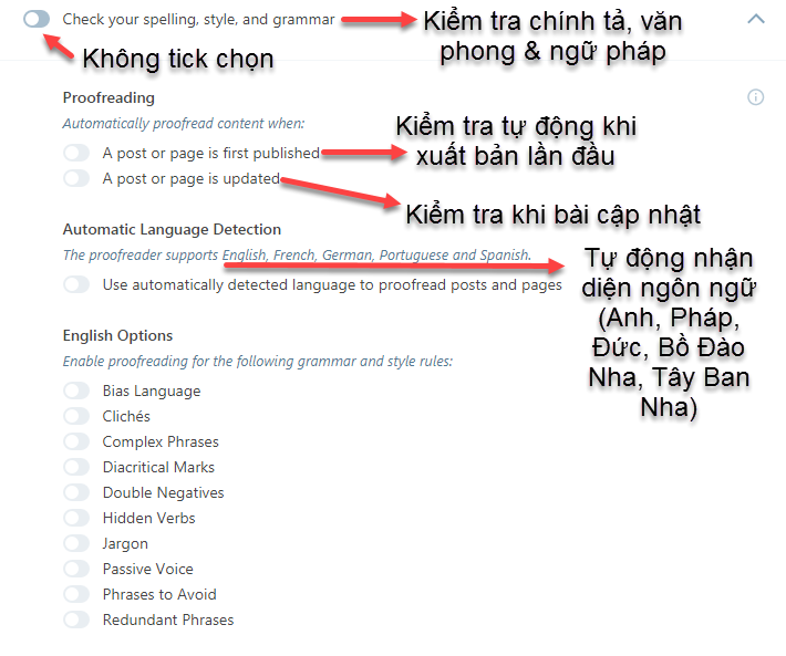- Check your spelling, style, and grammar: Nghĩa là kiểm tra chính tả, văn phong và ngữ pháp, tuy nhiên nó chỉ có ích với một số ngôn ngữ như: tiếng Anh, Pháp, Đức, Bồ Đào Nha và Tây Ban Nha. Đặc biệt nếu bạn viết blog bằng tiếng Anh các tính năng của nó có thể rất hữu dụng, nhưng phần lớn chúng ta viết blog tiếng Việt thì tính năng này vô dụng. Do vậy bạn không cần bật nó. Tùy chọn tối ưu: Tắt